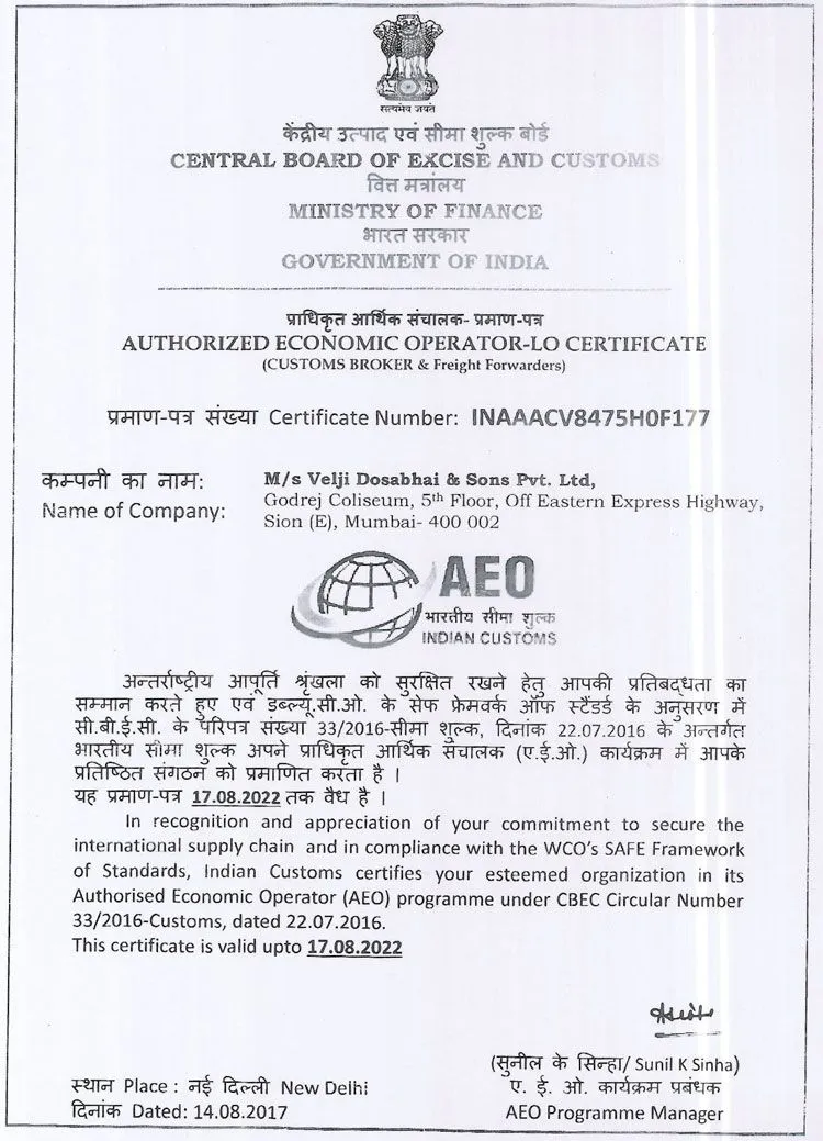VDSPL is a CRISIL certified, FDB-certified and a AEO certified company since 2016.