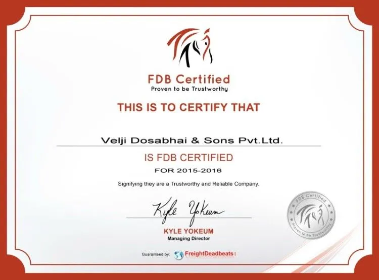 In 1925, there was a man with a vision. Mr. Velji Dosabhai. His vision was to provide a comprehensive range of export-oriented services to any corner of the world. His tools to achieve that vision were - hardwork, expertise, commitment, efficiency and the much needed confidence. Thus, was laid the foundation of M/s. Velji Dosabhai & Sons, as a partnership venture.